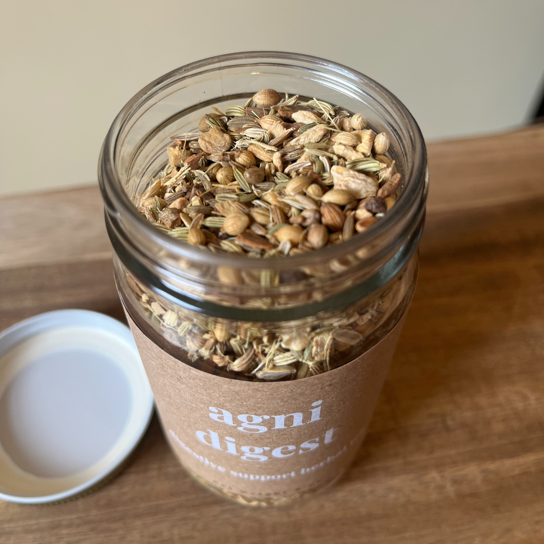 Agni Digest is a herbal tea that helps your tummy break down food and feel more comfortable after eating.